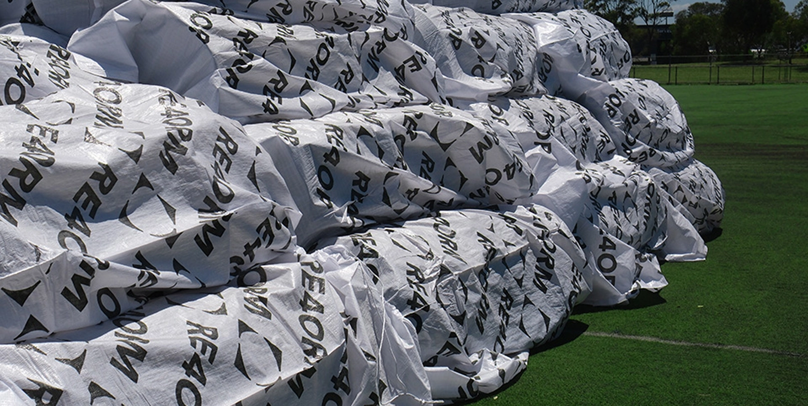 RE4ORM synthetic turf recycling – Large white tarpaulins with black writing, partially folded, are stacked on green artificial grass at an outdoor field. This setup highlights recycling benefits by encouraging tarpaulin reuse and reducing environmental impact amidst trees and fencing under a clear sky.